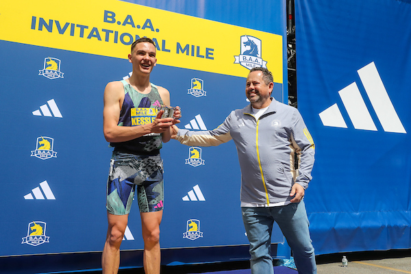 BOSTON (15-Apr) — It continued to be a great day here for the Michigan-based Very Nice Track Club coached by Ron Warhurst. After Morgan Beadlescomb’s win in the B.A.A. 5-K earlier this morning, his Very Nice clubmate Hobbs Kessler (adidas) won a slow and tactical race at the B.A.A. Invitational Mile to kick off his 2023 outdoor season. Kessler, who is just 20, got on the inside of Casey Comber (Under Armour) on the penultimate turn of the three-lap course and scooted to victory in 4:08.0.