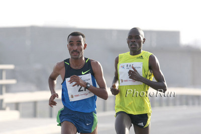 Deribe Merga and Patrick Makau Makau racing along the RAK half marathon course this morning in the UAE, photos by Photorun.net.