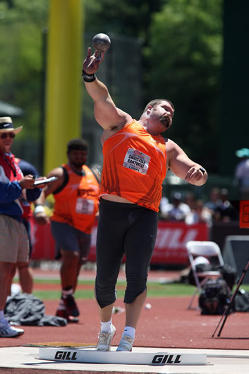 Christian Cantwell had a shot put dropped on his foot. ” I thought my season was over!” noted Christian, but he had taken the lead early, in 21.29, then 21.39m. In round five, Reese Hoffa cranked a 21.55m out there. So, what could Christian do? He pops a 21.82m throw on his last throw, watches his sixteen pound ball of steel land, and runs over the victory stand, goes to the top, and puts the number one up with his fingers. That was showman ship, and thank God he did not break his foot. Perhaps he should train, pretending only one foot works.