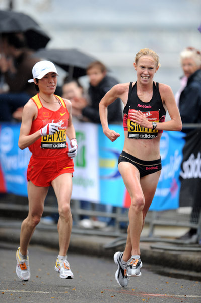 Kiwi Kim Smith passes Xie Bai of China, 2010 Virgin London Marathon,