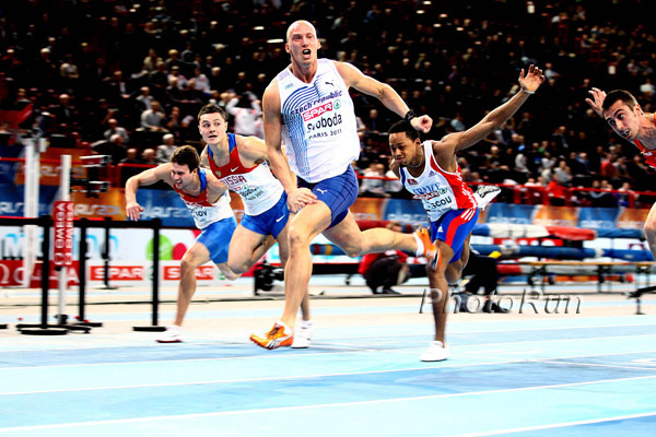Surprising even himself, Czech hurdler Petr Svoboda ran a scintillating 60 meter hurdle final, running 7.49 to take the European Indoor Championships. Garfield Darien of France gave France its second medal of the day, running a pb of 7.56. In third, Adrien Deghelt of Belgium hurdled a pb of 7.57.