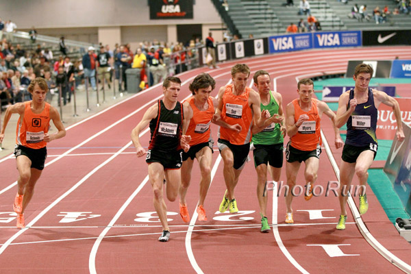 Men’s mile: a little bit of roller derby, and a lot of elbows! 2011 USA Indoors, photo by PhotoRun.netOn day two of the USA Indoors, I was in Seattle, watching a supremely satisfying Brooks PR invitational. The USA Indoors had nine world leaders and two ARs, and yet, a race that many said was the most satisfying of the day, the men’s mile, did not get on ESPN (would love someone from the production team to explain that).
