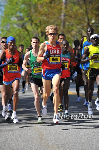 Men have just taken off. Ryan Hall is up in the lead for the third year in the row. My take is, I find it very hard to believe that an athlete without a coach can win a major marathon. Ryan Hall could make me eat those words.