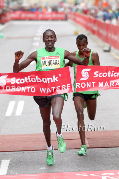Kenneth Mungara wins two steps over Shami Dawit, in 2:09:51, 2011 ScotiaBankToronto Marathon, photo by PhotoRun.net