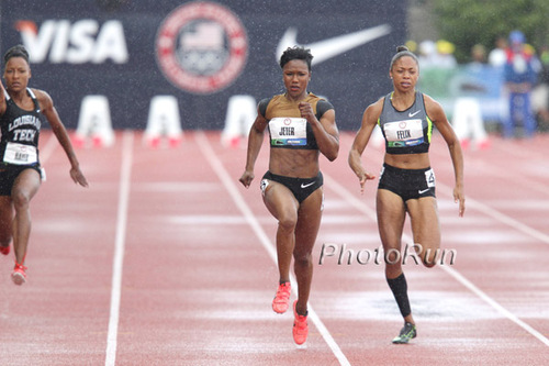 Photo finish: Jeneba Tarmoh and Allyson Felix, 100 meters 2012 U.S. Olympic Trials, Photo by PhotoRun.net