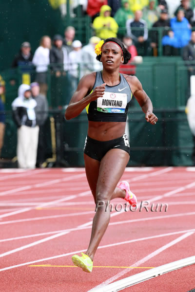 In her semi on Saturday Montano blitzed a 55-point opening 400-meters–a world-class first split–reaching 600-meters with a two second lead.