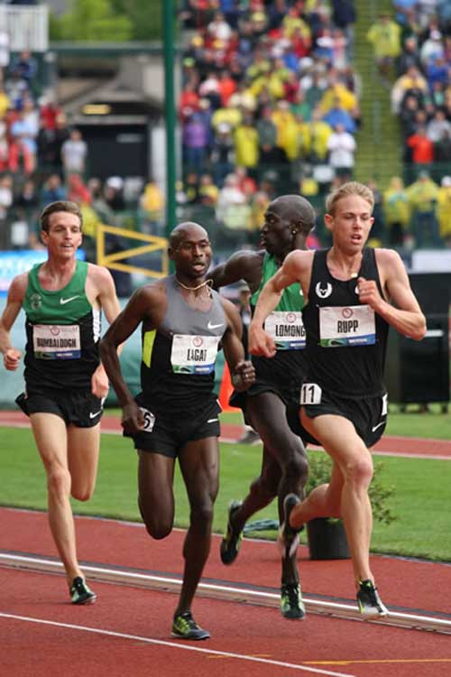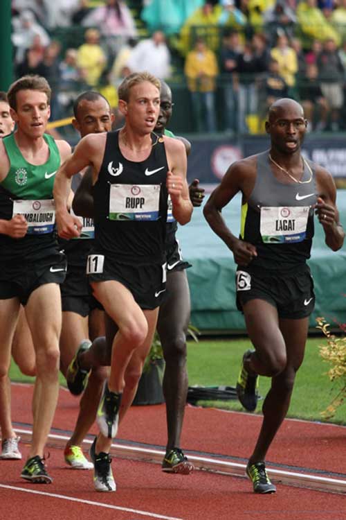 Galen Rupp fought back when Bernard Lagat went by with 200 meters to go, and won the 5,000 meters, giving him the 5,000m/10,000m double at the 2012 Trials, and also breaking the meet record of the late Steve Prefontaine.