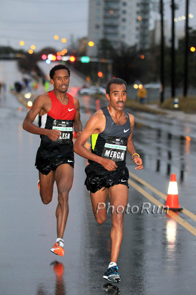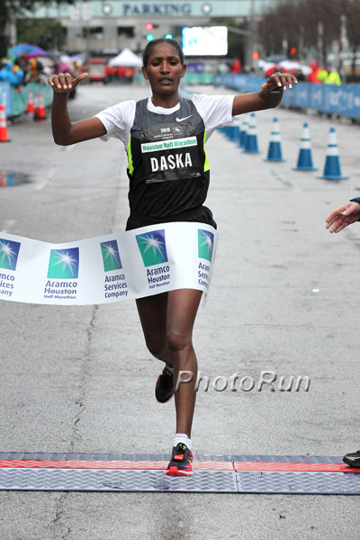 HOUSTON (USA, Jan 13): In a repeat from last year, athletes from Ethiopia swept all four titles at the Chevron Houston Marathon and Aramco Half-Marathon, successfully battling cold temperatures, sometimes heavy rain, standing water, and strong winds. Informs Race Results Weekly. Despite the harsh conditions, Merima Mohammed ran the second-fastest time ever for a woman here, breaking away from compatriot Buzunesh Deba at 33 kilometers and winning in 2:23:37. The 20 year-old, who previously won marathons in Düsseldorf and Ottawa, finished only 31 seconds off of her personal best, despite dealing with a painful injury during the race. Deba, who was scheduled to run the ING New York City Marathon last November before it was canceled in the wake of super storm Sandy, finished nearly a minute back in 2:24:26. Meskerem Assefa, a two-time Olympian and former middle distance track star, ran a solid debut time of 2:25:17. The top American was Tera Moody who finished sixth in 2:39:10. Before her as top European Olena Burkovska of Ukraine as fifth in 2:34:56. Men’s marathon champion Bazu Worku came into today’s race as the fastest marathoner of all-time who had never won a marathon. That changed today as he waxed the field by more than two and one-half minutes, breaking the finish tape next to the George R. Brown Convention Center in 2:10:17. Ethiopian men took the first six places: Teferi Balcha was second in 2:12:50 and Solomon Molla was third in 2:14:37. The top American was Andrew Carlson as seventh in 2:17:16. In the half-marathon, defending champion and reigning IAAF World Championships Marathon bronze medalist Feyisa Lelisa won a two-way battle with Ethiopian compatriot Deriba Merga, who was the marathon champion here in 2009. Lelisa clocked 1:01:54 ahead of Merga 1:02:00 Kenya’s Wilson Erupe, who made up a lot of ground in the second half, got third (1:02:12). Finishing fourth and taking top honors amongst Americans was former Oregon Duck Shadrack Biwott who acquired his USA citizenship last June. He had hoped to run faster than his 1:02:23, but was satisfied given the conditions. In winning the women’s half-marathon, Mamitu Daska became the first woman to win both the Chevron Houston Marathon and Aramco Houston Half-Marathon during a career. She won the marathon in 2011 in 2:26:33, then completely dominated the half-marathon here in 1:09:53, beating second place Caroline Kilel of Kenya by more than two minutes (1:11:58). Kenya’s Hellen Jemutai was third (1:12:54).