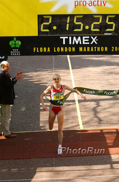 Making the right hand turn onto the Mall for the final 300 meters to the finish line, accompanied by her only remaining pacer, Loywapet, Radcliffe was buoyed by the cheers of her countrymen and she sprinted for home. The clock ticked up slowly in front of her, and she broke the tape with a look more of relief than triumph. Stomach troubles had been plaguing her, at least partially due to the fumes from one of the motorcycles transporting a television cameraman.