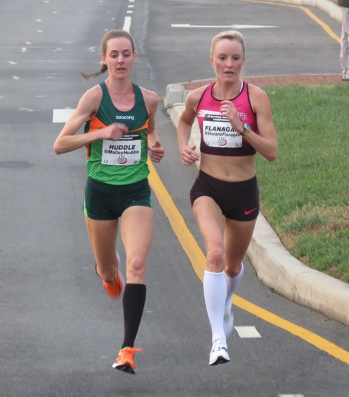 ALEXANDRIA, Va. (17-Nov) — Ten kilometers into the 12-K .US Road Running Championships here this morning, time seemed to stand still for Molly Huddle and Shalane Flanagan. Their ponytails bobbing behind them, the two national record-holders ran side by side through the quiet streets of this picturesque Washington, D.C. suburb. Eyes always focused ahead, they almost seemed frozen in place.