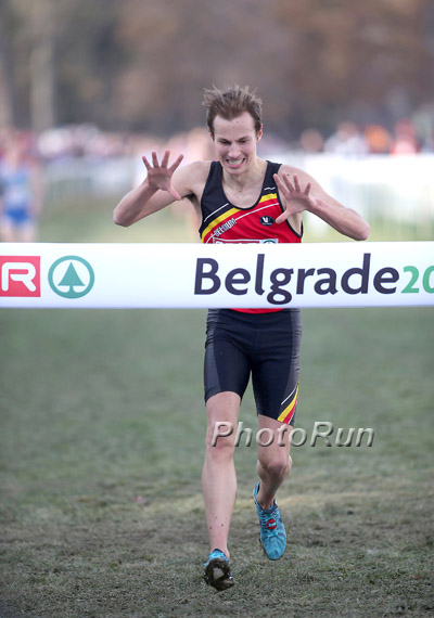 Celebrating with smiles, fist pumps and waves of his arms, Pieter-Jan Hannes earned Belgium’s first men’s Under-23 European Cross Country gold medal, timing 24:02 for the 8 kilometer course.