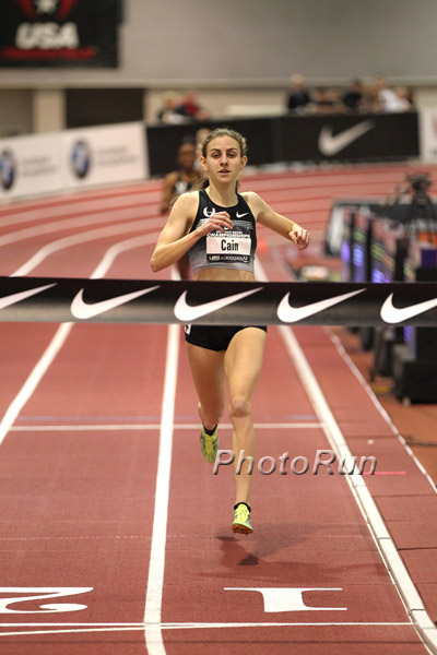 Mary Cain won the 1,500 meters in a masterful fashion on Sunday afternoon. Showing racy savvy way beyond her seventeen years, Mary Cain stayed near the front, out of trouble the pace averaged a solid 4:10 pace. Using a sub 60 second last 400 meters, Mary Cain, who was in control by the 1100 meter mark, defended her title in 4:07.05, which was pretty impressive for the 5,000 foot environs that Ms. Cain was racing in. Her teammate, Treniere Moser, coming back from a last summer injury, was second, just over two seconds back, joining Mary Cain in Sopot, Poland in two weeks.