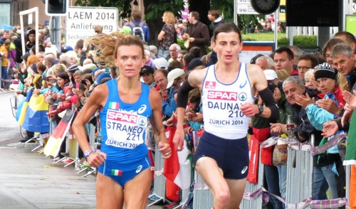 ZÜRICH (16-Aug) — For two hours and 12 minutes, France’s Christelle Daunay and Italy’s Valeria Straneo ran in lock-step at the European Championships Marathon here this morning. Two of the oldest competitors in the race at 39 and 38 years-old, respectively, they were on pace to break both the championships and Swiss all-comers records in one fell swoop, despite having to climb and descend a 44 meter hill on each of the 10-kilometer loops which made up the heart of the course.