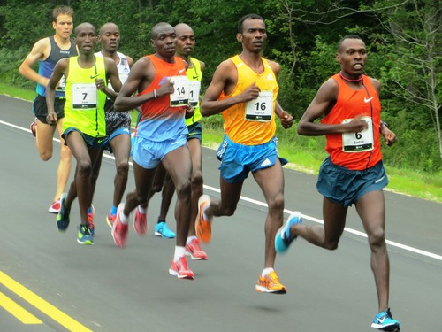 PHOTO: Eventual winner Bedan Karoki of Kenya (right) leads the elite men’s field of the 2014 TD Beach To Beacon 10-K. Ethiopia’s Markos Geneti is right behind him, followed by Stephen Kosgei Kibet (photo by Chris Lotsbom for Race Results Weekly)