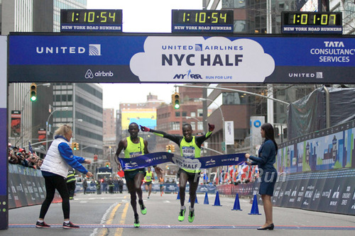 NEW YORK (15-Mar) — Plain and simple, Molly Huddle ruled the streets of Manhattan here this morning at the tenth edition of the United Airlines NYC Half. Controlling the race and making her presence known mile after mile, the 30-year-old Notre Dame grad from Providence, R.I., became the first American champion in race history, breaking the tape in a personal best of 1:08:31, equaling the course and event record.