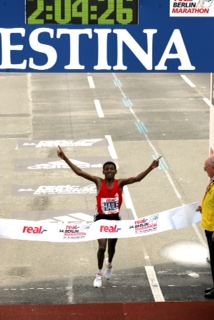 PHOTO: Haile Gebrselassie setting the world record in the marathon at the BMW Berlin Marathon in 2007 when he ran2:04:26 (photo courtesy of the BMW Berlin Marathon), used with permission