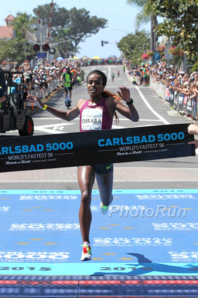 “This year, I’ve moved to the 5000,” said Dibaba in an interview soon after she won the March 29 Carlsbad road race. “I’ve been doing good training with my coach, and God having willed it, I broke the indoor 5000m record. That was a great race. During it, I was a little concerned that it might be tough for me at the end, so I was minding my pace and saving myself, but otherwise, I could have run faster than I did. I wasn’t very tired when I finished the race.”