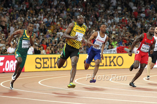 Usain Bolt coming off the turn, 200m final, August 27, 2015, photo by PhotoRun.net