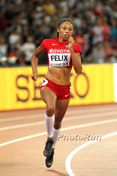 Allyson Felix took the 400 meters out crazy fast, and in that, ended the chances of her toughest rival, Christine Ohuruoghu, she of the perfect final straight running, who ran out of gas. Felix floated from 200m to 300m, then, put on the gas and ran away from the field in a PB of 49.26.