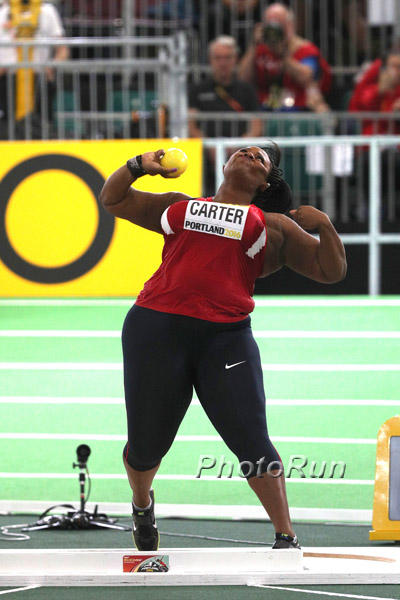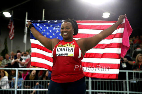 Carter stepped into the ring after a brief break while Boris Berian of the U.S. stormed to a win in the men’s 800 meters bringing the sold-out crowd in the Oregon Convention Center to a roar. Carter crouched and jumped backward, throwing the shot and immediately raising one hand in the air.