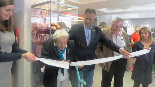 PHOTO: Dana Zatopkova cuts the ribbon to open the Emil Zatopek exhibit at the Running Mall in Prague with RunCzech President Carlo Capalbo (center). Photo by Chris Lotsbom for Race Results Weekly, used with permission.