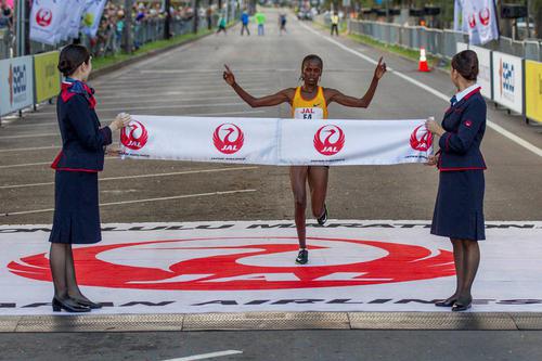 PHOTO: Brigid Kosgei celebrates her 2016 Honolulu Marathon victory, becoming on the second Kenyan woman to win the race (photo by Honolulu Marathon Association photo team)