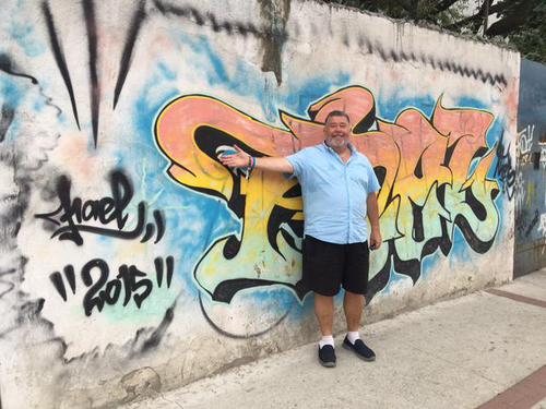 Larry Eder standing by a favorite wall of grafitti in Engenhao, photo by Brian Eder