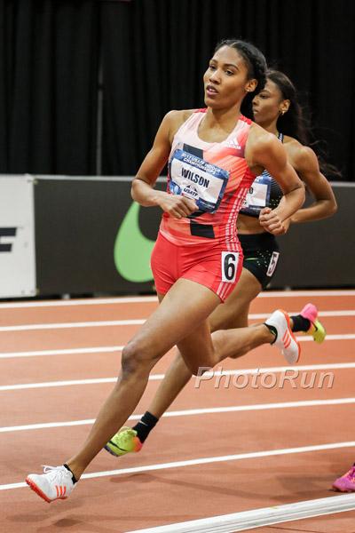 certainly is. Unbeaten this winter, with an American indoor 800 record (1:58.27) already in her portfolio, Wilson ran the third fastest 600 in track history, holding off Olympic 4×400 relay gold medalist Courtney Okolo to win Nationals, 1:23.84 to 1:24.00.