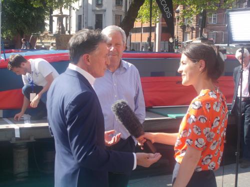 Seb Coe, President of IAAF, with Brendan Foster, Great Run, being interviewed, photo by Phil Oldham