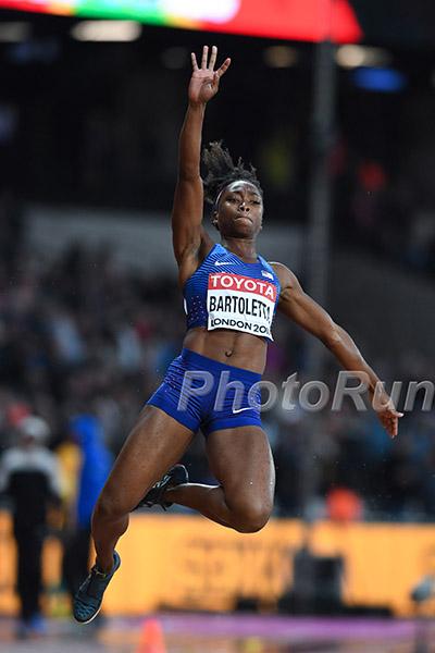 Tianna Bartoletta was trying to get her steps down, and was not in the game until fifth jump. In her sixth, she took the bronze in 6.97m. Spanovic was at 6.96m.