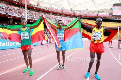 Tsegay, Ghebrselassie, Mutai, medalists from Beijing 2015 WC, photo by PhotoRun.net