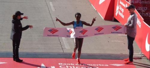 PHOTO: Tirunesh Dibaba wins the 2017 Bank of America Chicago Marathon in 2:18:31, her second sub-2:19 marathon of the year (photo by Jane Monti for Race Results Weekly)