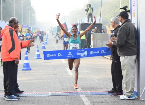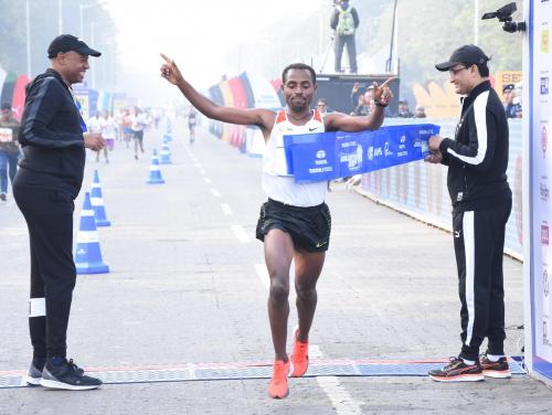 Azimeraw crossed the line in 1:26:01 to pick up her first prize cheque of US$7500 and celebrate the biggest payday of her life, as well as making it an Ethiopian double triumph in Kolkata. Kiprop hung on for second in 1:26:04 with Matanga third in 1:26:11.