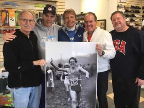 Craig Virgin, with Marcus O’Sullivan (far right) and staff of Runningworks, photo by Jeff Benjamin, Staten Island