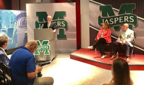 President Brennan O’Donnell speaking, Athletic Director Marianne Reilly with Matt Centrowitz, Sr., seated, photo by Jeff Benjamin, August 22, 2018