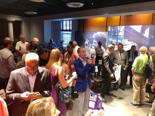 Alums, media at Matt Centrowitz, Sr. Introduction, photo by Jeff Benjamin, August 22, 2018