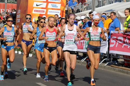 Fifty-six women from 20 countries were entered in this morning’s race, and the field set off at 09:05 on a special criterium course, consisting of four, 10-kilometer loops and one 2.195-kilometer loop. The early pace was honest for a summer championships, with with the first 5-kilometers passing in 17:31 and the second in 17:41. That put the field on pace for a sub-2:29 finish time. Mazuronak was the leader at both of those checkpoints, accompanied by eight more women: Clémence Calvin of France, Eva Vrabcova of the Czech Republic, Maryna Damantsevich and Nastassia Ivanova of Belarus, Sara Dossena and Catherine Bertone of Italy, Martina Strähl of Switzerland and Trihas Gebre of Spain.