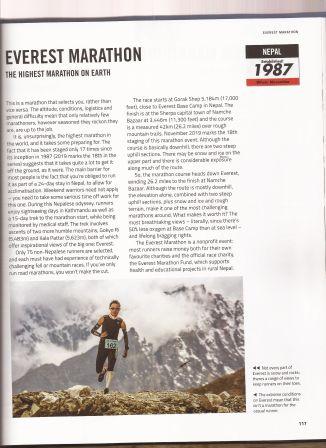 A section entitled “modern marathons” includes Istanbul -where the route crosses continents, the great wall marathon in China and the Loch Ness marathon. “Weird and wonderful marathons” describes the Big FIve Safari Marathon, the Everest marathon, Kilimanjaro marathon, Le marathon de Medoc which includes a wine party, the Midnight Sun marathon and the North Pole marathon among many others.