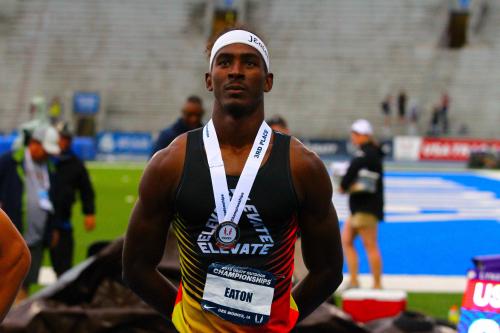 Jarret Eaton: The experience I had at USA outdoors was unique. The outdoor season had not been going as planned ,due to injuries and other limiting factors, but I was again focused on what I had to get done to perform to my best. I knew there would be no hype around me as there were other hurdlers who this time ran faster than me, so I enjoyed the silence. I made it though the rounds and was ready to run the finals when a huge storm came through and delayed everything. It was untimely, but it was something you just had to deal with, another hurdle in the way. After the storm delay, we got out there and I remember being in the outside lane all to myself. It gave me the blinders I needed to just be able to run my race. Coming off the last hurdle, I could feel some people with me, so at the last moment, I leaned really hard and ended up losing balance and slid on the track after I crossed the line. Its more common than you see ,but luckily the ground was wet, so I slid like a slip and slide with no track burns added. I placed third which is my highest ranking ever at the outdoor championships and I was extremely proud of myself.