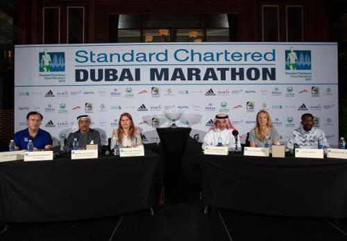 2019 Standard Chartered Dubai Marathon Presser Picture shows: (Left to right) Peter Connerton (Event Director), Ahmed Al Kamali (Event General Co-ordinator) Rola Abu Manneh (Standard Chartered Bank UAE, CEO), H.E Saeed Hareb (Secretary General, Dubai Sports Council), athlete and broadcaster Paula Radcliffe, and Guye Adola, the fastest man in the line-up for Friday’s race.