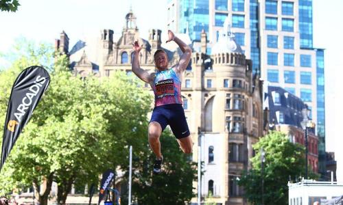 Greg Rutherford soars, Manchester Great CityGames, photo by Great Run Company
