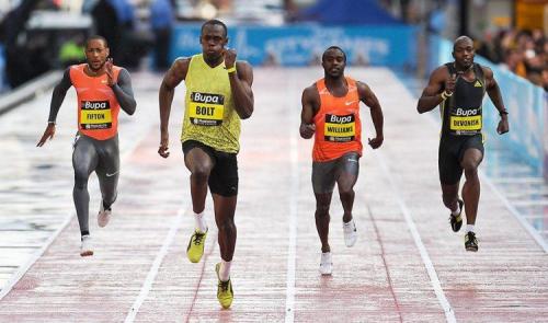 Usain Bolt running history’s fastest, Manchester Great CityGames, photo by Great Run Company