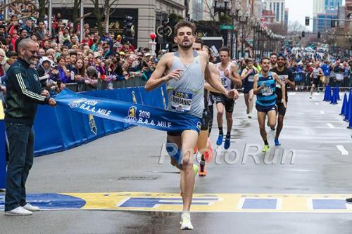 Approaching the final turn onto Boylston Street and towards the finish line, Domanic held the lead, an advantage he would not relinquish. Surging towards the line, he held off the hard charging O’Hare, 4:06.4 to 4:06.9. “This is my first race as a pro,” Domanic enthused. “There were so many people around the course. There was no place to let up. I knew I just needed to be up front with 400m to go.” Domanic was quickly engulfed in a hug from coaches and teammates upon breaking the tape.