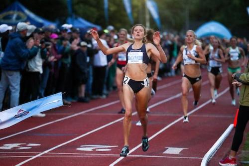 Nicki Hiltz wins HP 800m Womens, even with a rather large watch tan line, photo by Kevin Morris/2019 Adrian Martinez Classic