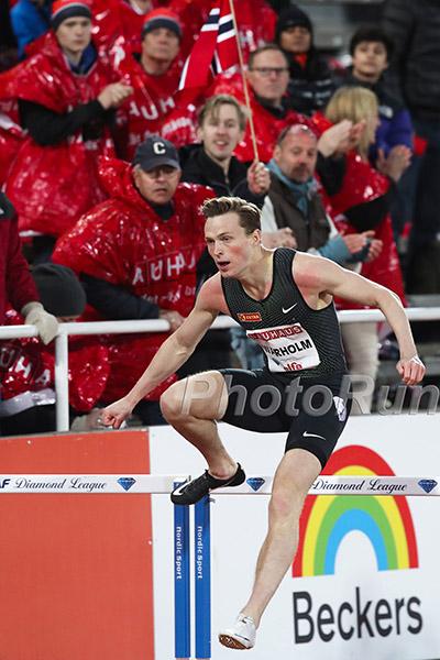 HAMAR (NOR, Aug 2): Sensational Karsten Warholm clocked 47.43 (3rd best of his career) to win the national title at 400 m hurdles. It is the best ever achieved time at national championships (except of USA) and with biggest winning margin at this level (3.54 s). Second Andreas Bakketun improved the national U20 mark to 50.97 and will belong to U20 category also in 2020. After 1:20 hrs after this run (13 strides for the full distance) Warholm won the 400 m round one in 47.93 and will run the finals on Saturday. Henrik Ingebrigtsen won the 5000 m title in 13:50.77, when marathon runner Sondre Nordstad Moen was third 13:57.88. Jakob Ingebrigtsen was best in his 1500 m heat with tactical 4:02.01. Amalie Iuel won the 400 m hurdles of women in 56.08 and also later won her flat heat in 55.47. Ingar Kiplesund won long jump 793 (0.0) and Ola Stunes Isene discus 63.17. In the 100 m finals titles for Ezinne Okparaebo 11.40 (+1.6) and visually impaired Salum Kashafali 10.37 (+2.3).