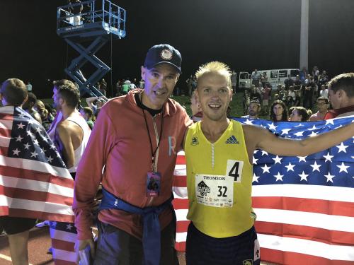 Jeff Benjamin With Jacob Thomson right after Thomson’s first sub-4 Mile, which he accomplished in 2018 at the Sir Walter Mile (3:57.07)! photo by Jeff Benjamin