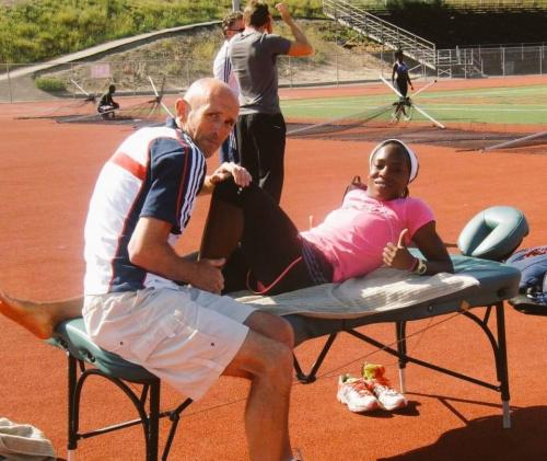 Neil Black with Maz Okoro. To Maz, Neil Black was “the best physio to walk the earth”, photo by Stuart Weir