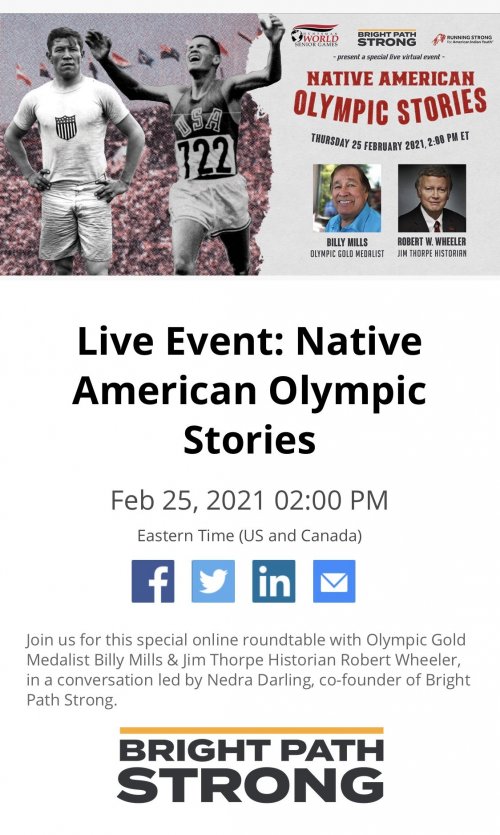 This upcoming Thursday, Feb. 25th, two legends will be discussing “Native-American Olympic Stories” and you couldn’t have come up with a better combination on the subject than Billy Mills and Robert Wheeler.
