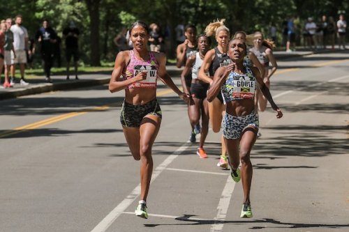 Ajee’ Wilson and Natoya Goule battle over 600m street race! adidas Boost Boston, May 23, 2021, photo by Kevmofoto