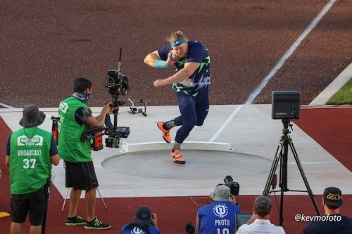 Ryan Crouser, pushing the steel orb farther and farther, photo by Kevin Morris /Kevmofoto